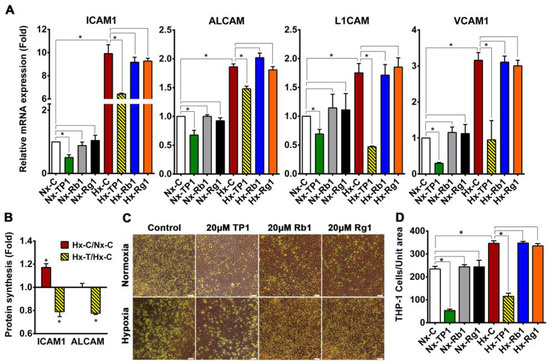 HUVEC-CS cells were seeded in 6-well plates and grown as a monolayer in DMEM supplemented with 20 µM TP1 (or the PBS control) under normoxic or hypoxic conditions for 24 h. The ginsenosides Rb1 and Rg1 were used as reference controls at 20 µM. THP-1 cells were cultured in RPMI medium supplemented with 10% FBS. Immediately prior to their use in adhesion assays, the THP-1 cells were harvested, washed three times with PBS, and labeled with 10 µM carboxyfluorescein succinimidyl ester (CFSE) for 10 min at 37 °C. The cell culture medium was aspirated from the HUVEC-CS monolayers, which were then washed with a serum-free RPMI medium. CFSE-labeled THP1 cells were then seeded onto the HUVEC-CS monolayer at a density of 2 × 105 cells/well in serum-free RPMI medium and incubated for 90 min at 37 °C. After incubation, the culture medium was drained, and the HUVEC-CS monolayer was washed three times with PBS to remove nonadherent leukocytes. Images of adherent leukocytes were then captured using the green fluorescence channel of a Nikon ECLIPSE Ti-S inverted microscope system (Nikon, Yokosuka, Kanagawa, Japan). Cells were quantified via cell counting, and statistical analyses were performed using data collected in triplicate experiments.