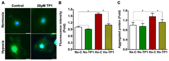 Autophagy is an essential cell process, a principal component of the integrated stress response [37], and part of the ER stress-mediated proadoptive UPR response [35,36]. Indeed, Western blot analysis revealed that the ratio of LC3B-II/LC3B-I increased significantly upon TP1 treatment under hypoxic conditions (Figure 5E,F), indicating an increase in autophagosome formation [37]. TP1-treatment also increased P62 degradation in hypoxic ECs and resulted in a lower level of P62 in these cells (Figure 5E,F), further confirming the activation of autophagy. Overall, our Western blot results indicated that TP1-induced selective autophagy occurred in ginsentide-treated hypoxic cells. Thus, TP1 promotes the clearance of accumulated proteins and suppresses apoptotic signaling to prevent the ER-stress-induced death of hypoxic cells. Indeed, when we measured protein aggregation using thioflavin-T staining and fluorescence microscopic analysis, we found a 1.6-fold increase in protein accumulation in hypoxic HUVEC-CS cells, which was effectively reversed by TP1 treatment (Figure 6A,B). The protective effect of TP1 against hypoxia was also confirmed using alternative cell lines, i.e., H9c2, A7r5, and C2C12, in which the reduction in thioflavin-T staining upon TP1-treatment was comparable to that in HUVEC-CS cells (Figure S11A,B). Consistent with the fluorescence-based analyses, the ultracentrifugation and quantitation of protein aggregates confirmed that protein accumulation in HUVEC-CS cells during hypoxic stress was markedly reduced by TP1 treatment, suggesting that TP1 is an efficient stimulator of the UPR (Figure 6C).