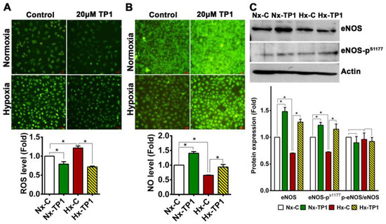 Under normal physiological conditions, NO maintains the quiescent state of the endothelium, while disruption of NO signaling can trigger the endothelial expression of mediators that promote leukocyte adhesion and inflammation [38]. Under oxidative stress conditions, the reaction of NO with superoxide anions generates peroxynitrite, which significantly impairs NO production by nitric oxide synthases, thereby promoting endothelial activation and progression to VED [38,39,40]. Given our finding that TP1 limits endothelial activation under hypoxic conditions, we assessed whether TP1 acts via effects on the generation of NO and reactive oxygen species (ROS). Using a fluorogenic staining approach, i.e., a 2′,7′-dichlorofluorescein diacetate (DCFDA) assay, we found that intracellular ROS levels were higher in hypoxic ECs than normoxic cells; however, TP1-treatment reduced ROS levels 1.4-fold in hypoxic ECs (Figure 7A,B). Similarly, a 1.3-fold reduction in intracellular NO was detected in hypoxic ECs, but this deficit was effectively reversed by TP1 treatment (Figure 7B). Accordingly, when the expression of eNOS was assessed using Western blotting, protein levels that were reduced under hypoxic conditions were partially restored by TP1 treatment (Figure 7C). Consistent with these data, hypoxic stress was found to induce a 1.3-fold decrease in eNOS phosphorylation at residue Ser1177, which is known to modify enzyme activity under both physiological and pathological conditions [41,42]; however, TP1-treatment reversed this deficiency in eNOS phosphorylation (Figure 7C). Taken together, our data indicate that TP1 limits ROS generation and maintains NO bioavailability to prevent endothelial activation under hypoxic conditions. Bioactive ginsenosides are known to counteract redox regulation, promote NO production, and prevent ROS generation; thus, they protect cells against oxidative damage [25,43,44,45]. Consistent with these reported effects, we found that treatment with the ginsenosides Rb1 and Rg1 reduced the intracellular ROS levels of both normoxic and hypoxic ECs, comparable with the impact of TP1 treatment (Figure S12A,B).