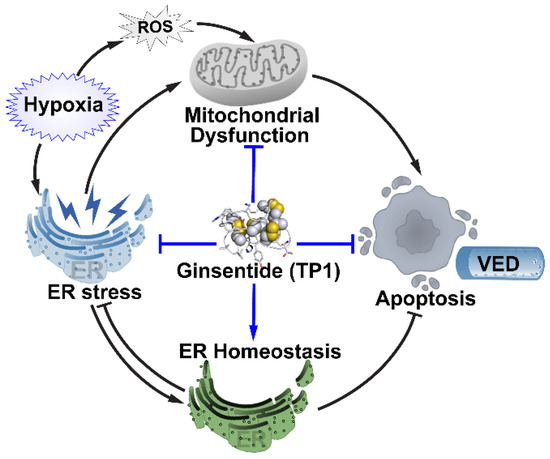 Ginseng, the most valuable herb in traditional medicines, is prescribed to treat a wide range of disorders, including cardiovascular disease [17,18,46]. Thus far, ginsenosides, which belong to the small-molecule metabolites of the triterpene saponin family, have received the most attention as the active compounds to account for the ethnomedicinal effects of ginseng [46,47]. Despite an abundance of ginseng research, ginsenosides alone cannot adequately explain the “cure-all” effect of ginseng in its ethnomedicinal uses [46,47]. Recently, we reported that the cell-penetrating cystine-dense microprotein TP1 coordinates multiple systems to exert anti-stress and cardiovascular benefits [25]. This report shows that ginsentide TP1 differing from the two key ginsenosides, Rb1 and Rg1, plays an important adaptogenic role in maintaining protein homeostasis in hypoxic cells and suppressing ER-stress-induced apoptosis.