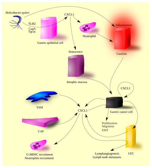 The role of CXCL1 in gastric cancer pathogenesis. Helicobacter pylori infection induces inflammatory reactions within the gastric wall, leading to gastritis and atrophic mucosa. These sequelae of H. pylori infection are partially mediated by CXCL1. The bacterium upregulates this chemokine’s expression through its virulence factors (Tip-α and CagA) and activation of TLR2. The persistent inflammatory state culminates in gastric cancer. Gastric cancer cells express CXCL1, which in turn amplifies its own production. Other sources of CXCL1 in gastric tumors include tumor-associated macrophages (TAMs), cancer-associated fibroblasts (CAFs), and lymphatic endothelial cells (LECs). CXCL1 participates in tumorigenic processes, promoting the migration of gastric cancer cells. Furthermore, CXCL1 facilitates the recruitment of granulocytic myeloid-derived suppressor cells (G-MDSCs) and neutrophils. CXCL1 also influences LECs, resulting in lymphangiogenesis and the migration of gastric cancer cells to lymphatic vessels, ultimately leading to lymph node metastasis.