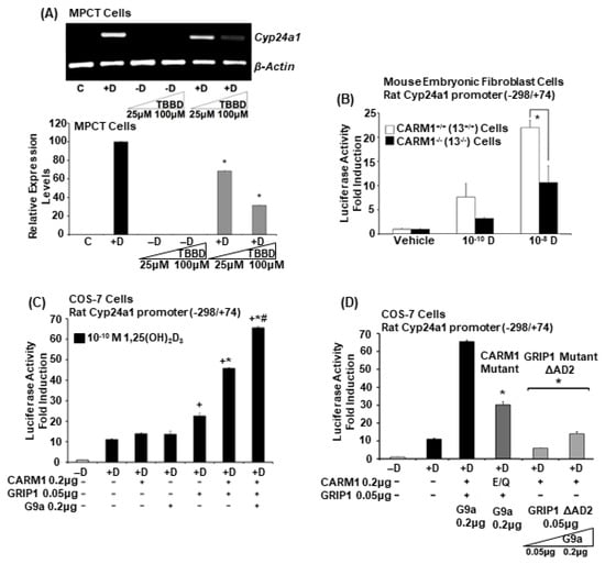 Although previous studies noted a major role of methylation in transcriptional regulation of steroid hormones and identified CARM1 as a transcriptional secondary coactivator for steroid receptors (primarily by methylating H3R17), very little is known about the role of methyltransferases in VDR-mediated transcription. Since CYP24A1 has an essential role in the control of calcium homeostasis, regulating blood levels of 1,25(OH)2D3 by its 1,25(OH)2D3 and 25(OH)D3 catabolic activity, we examined a possible requirement of H3R17 methylation for VDR-mediated Cyp24a1 expression using cells from renal proximal tubule, the site of regulated expression of CYP24A1 as well as CYP27B1 in the kidney and TBBD, a uniquely specific inhibitor of H3R17 methylation and a target for CARM1 methyltransferase activity [38]. Analysis of Cyp24a1 expression in MPCT cells treated with vehicle (−D), 10−8 M 1,25(OH)2D3 (+D), TBBD alone (25 µM or 100 µM) or 10−8 M 1,25(OH)2D3 in combination with TBBD (25 µM or 100 µM) for 24 h revealed a significant inhibition of 1,25(OH)2D3 induction of Cyp24a1 in the presence of increasing concentrations of TBBD (p < 0.05 compared to +D alone (Figure 1A)).
