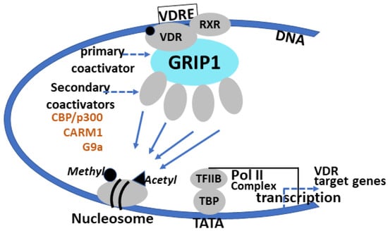 The importance of GRIP1 was noted in our studies. The GRIP1 mutant lacking the binding site for CARM1 (C-terminal AD2 region; ΔAD2) compromised the coactivator synergy of CARM1, G9a, and GRIP1 in VDR-mediated transcription. Early studies noted that CARM1 but not other PRMTs were involved in the coactivator function of G9a [23]. The C terminal activation domain of GRIP1 (AD1) is involved in recruitment of CBP/p300, whereas CARM1 binds to the AD2 domain [23]. CARM1 and p300/CBP are secondary coactivators. A ligand-dependent interaction of GRIP1 with the AF2 domain of steroid receptors (GRIP1 as a primary coactivator) is mediated via the steroid receptor transcription factor interaction domain containing a series of conserved motifs (LXXLL sequence motifs, where L is leucine and X is any amino acid) termed NR box [53]. Thus, GRIP1 contributes to transcription by inducing recruitment of secondary coactivators that can acetylate or methylate histones, other coactivators, transcription factors and non-histone proteins. SRC-1, the first member of the SRC family of coactivators, which binds directly to steroid hormone receptors, was discovered in the laboratory of Dr. B. O’ Malley in 1995 [54], followed by the identification of GRIP1 (SRC-2) [55,56,57,58,59,60,61]. Although in our studies we examined GRIP1 as a primary coactivator, the other members of the SRC family also serve similarly as primary coactivators for steroid receptors to recruit secondary coactivators [62,63]. Recent studies by Moena et al. [64] noted the importance of SRC-1 and histone acetylation in the regulation by 1,25(OH)2D3 of CYP24A1 in bone cells. Studies by Meyer and Pike using ChIP-seq analysis of 1,25(OH)2D3 target genes in LS180 human intestinal epithelial cells found that SRC-1 binding was most highly correlated to VDR/RXR binding at enhancer elements and tracked most closely to 1,25(OH)2D3 regulated genes, including CYP24A1 and TRPV6 [65]. SRC-1 was not detectable before treatment with 1,25(OH)2D3. Morena et al. also noted that CARM1 knockdown prevented H3R17me2a enrichment at CYP24A1 VDR binding sites in response to 1,25(OH)2D3 and repressed 1,25(OH)2D3 induction of CYP24A1 mRNA. SRC-1 knockdown prevented the H3R17 enrichment at the VDR binding sites, further suggesting an interrelationship between CARM1-dependent histone methylation, p160 coactivators and histone acetylation [64]. We previously noted that PRMT5, a type II PRMT, by interacting with BRG1 (a component of the SWI/SNF chromatin remodeling complex, that cooperates with VDR in the induction of Cyp24a1 transcription), is part of a complex involved in the transcriptional repression of Cyp24a1 [26]. Although we did not address mechanisms involved in the repression of Cyp24a1 in the absence of 1,25(OH)2D3, we noted that symmetrical dimethylation of H3R8 and H4R3 was increased in 1,25(OH)2D3 treated cells transfected with PRMT5 [26]. Our findings suggested that these histone methylations may mediate, in part, the PRMT5 repression of 1,25(OH)2D3 induced Cyp24a1 transcription at times when protection against hypercalcemia is not needed. In support of our findings, Morea et al. noted that PRMT5 knockdown in ROS17.28 cells treated with 1,25(OH)2D3 resulted in a decrease in symmetrical H4R3 at VDR binding sites and an increase in Cyp24a1 [64]. These findings provide further evidence for a role of methyltransferases in VDR-mediated transcription.