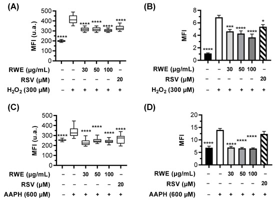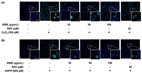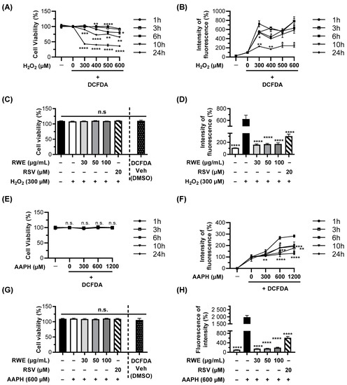 3.2. RWE Inhibits ROS Levels Induced by Oxidative Stress in ARPE-19 Cells
