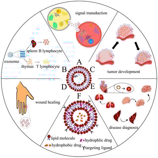 The multiple functions of exosomes: (A) Exosomes are involved in intercellular signaling, and cells can exert regulatory effects by secreting exosomes that carry biologically active substances to transmit signals to neighboring or distant cells; (B) exosomes can induce immune responses by antigen presentation, regulate immune responses by interacting with immune cells, or produce immunosuppression; (C) tumor cell-derived exosomes induce tumor angiogenesis by carrying angiogenesis-stimulating factors such as VEGF, FGF, and IL-8; (D) exosomes promote wound healing by regulating macrophages and fibroblasts; (E) exosomes are used as biomarkers for disease diagnosis; (F) exosomes are natural carriers of drugs, enhancing drug stability and effective drug delivery to the target region.