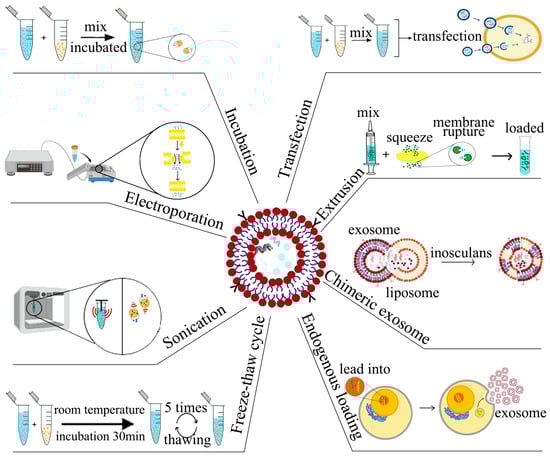 In addition to loading small-molecule and nucleic acid drugs, electroporation can be employed to directly load protein drugs into exosomes. Although incubation is a possible method for introducing protein drugs into exosomes, electroporation appears to have higher loading efficiency. Rodríguez-Morales et al., successfully obtained exosomes containing insulin by mixing exosomes with insulin (in a volume of 400 μL) and subjecting them to electroporation, followed by incubation at 37 °C for 1 h. They found that the highest loading efficiency was achieved when the electroporation conditions were 200 V and 50 μF, and that the loading efficiency of exosomes from different cell sources varied under the same electroporation conditions. Notably, the efficiency of this electroporation method was significantly higher than that of exosome loading using the room temperature incubation treatment [102]. Lu et al., mixed recombinant Yap1 protein and platelet-derived exosomes in the electroporation buffer followed by their electroporation using a Gene Pulser II electroporation system. rPLT-Exo-Yap1 could suppress oxidative stress-induced senescence-related phenotypes by inhibiting the Ikβα and NF-κB axes. Furthermore, an rPLT-Exo-Yap1-functionalized GelMA hydrogel was capable of promoting the stemness of tendon stem/progenitor cells (TSPCs) and functional recovery of endogenous TSPCs, thereby, supporting tendon regeneration [103]. Wan et al., added Cas9 ribonucleoprotein complex (RNP) in electroporation buffer and subjected the mixture to electroporation to form exosome complexes without significant changes in the size and morphology of the exosomes. A Western blot analysis showed that the loading efficiency was significantly higher than that of other methods. The administered exosome complexes could be effectively targeted to the liver and used for the treatment of liver diseases [98].