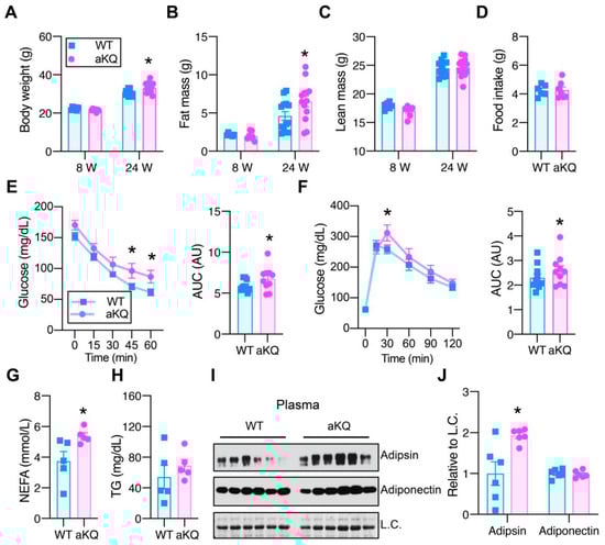 In a previous report, we found constitutive PPARγ acetylation in adipocytes (aKQ model) to impair adipose plasticity in response to nutrient challenges [17]. These aKQ mice displayed normal body weight at 8 weeks old, but interestingly gained more body weight than their controls at 24 weeks old (Figure 1A). This increased body weight was ascribed to higher fat mass but not lean mass (Figure 1B,C), owing to the decreased energy expenditure previously observed [17], while the aKQ mice had comparable food intake to the WT mice (Figure 1D). This pro-obesity phenotype is age-associated, becoming more significant at 1 year old [17]. Given their augmented adiposity, middle-aged aKQ mice displayed worsened insulin sensitivity and glucose tolerance (Figure 1E,F). In line with their insulin resistance, they had increased plasma NEFA levels, while their plasma TG levels were comparable to that of the control mice (Figure 1G,H). Moreover, plasma adipsin levels were increased in middle-aged aKQ mice (Figure 1I,J), reinforcing that Adipsin is a specific downstream target of PPARγ acetylation [18]. In contrast, their adiponectin levels remained constant (Figure 1I,J). Collectively, these data demonstrate that PPARγ acetylation in adipocytes intensified the metabolic complications associated with aging, consistent with observed hyperacetylation of PPARγ observed in aging [17].