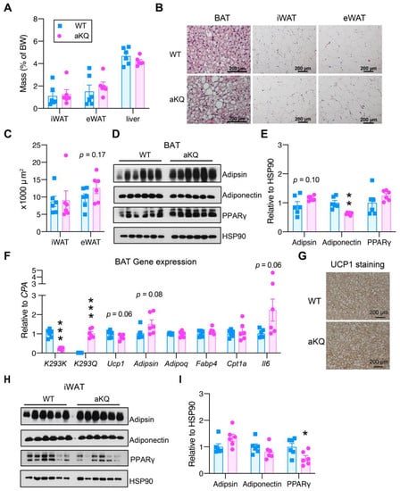 Differential effects on adipose tissues in middle-aged aKQ mice. Middle-aged male mice fed a chow diet were sacrificed after an overnight fast. (A) Tissue mass normalized to body weight. (B) Representative H & E staining of brown adipose tissue (BAT), inguinal WAT (iWAT), and epididymal WAT (eWAT). Scale bar: 200 µm. (C) Quantification of WAT adipocyte size. (D,E) WB with quantification of Adipsin, Adiponectin, and PPARγ proteins levels in BAT. (F) qPCR analysis of gene expression levels in BAT. (G) Immunohistochemical staining of UCP1 protein in BAT. (H,I) WB with quantification of Adipsin, Adiponectin, and PPARγ proteins levels in iWAT. Data are presented as mean ± SEM, two-tailed Student’s t-test. * p < 0.05, ** p < 0.01, *** p < 0.001, n = 6 and 6.