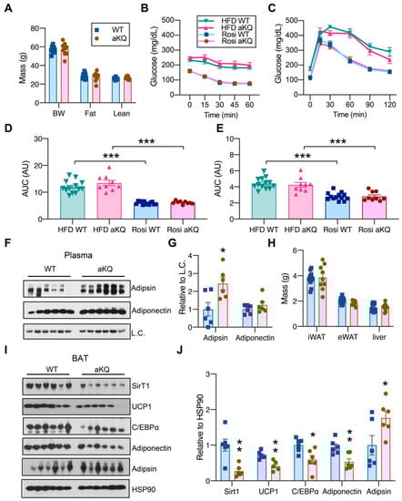 TZDs are full agonists of PPARγ that potently improve insulin sensitivity [27,28]. Next, we asked whether PPARγ acetylation in adipocytes affects the response to TZD treatment. To test this, we induced insulin resistance in the control and aKQ mice by feeding them an HFD for 16 weeks, with subsequent treatment of rosiglitazone. aKQ mice displayed a similar body weight and composition as control mice after rosiglitazone treatment (Figure 4A). aKQ mice had comparable insulin sensitivity (Figure 4B) and glucose tolerance (Figure 4C) to WT mice, no matter before or after rosiglitazone treatment, showing aKQ mice are still responsive to rosiglitazone (Figure 4D,E). Adipsin levels in the circulation were persistently increased in aKQ mice, while the adiponectin levels remained constant (Figure 4F,G). Upon sacrifice, there was no difference in iWAT, eWAT, and liver mass (Figure 4H). Given the blunted metabolic phenotype in aKQ mice, we did not focus on white adipose tissue. Instead, we further examined BAT since TZDs are well known to induce lipid filling in BAT [16]. Interestingly, this “whitening” phenotype of BAT was magnified in aKQ mice. The brown adipocyte marker UCP1 was decreased in the BAT of aKQ mice, together with the deacetylase of PPARγ, SirT1, which is enriched in BAT and conveys a pro-BAT function (Figure 4I,J) [16]. Adipsin, as a white adipocyte marker, was increased, whereas Adiponectin and its upstream regulator C/EBPα were both repressed. Therefore, despite retaining the full insulin-sensitizing response to TZD, aKQ mice remained impaired in BAT function.