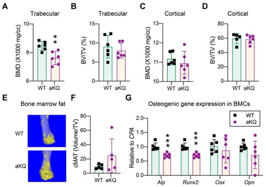 Bone loss is the most prevalent adverse effect of TZD treatment and can be inhibited by PPARγ deacetylation using a whole-body knock-in model of a constitutive deacetylation-mimetic 2KR mutant [18]. This bone loss effect involves active remodeling of both adipogenic and osteogenic programs. Here, we used the aKQ model to specifically dissect the contribution of PPARγ acetylation in adipocytes to this drawback. Three weeks of rosiglitazone treatment in the presence of resveratrol resulted in a lower bone mineral density (BMD) in the trabecular region of aKQ mice, without affecting bone volume (Figure 6A,B). The cortical region was not affected (Figure 6C,D). Osmium tetroxide staining of lipid droplets revealed a more than two-fold increase in bone marrow adiposity in aKQ mice, although not significant (Figure 6E,F). In line with their lower BMD, aKQ inhibited the expression of key osteoblast markers Alp and Runx2 in the bone marrow (Figure 6G), indicating an impaired osteogenic gene expression. Hence, PPARγ acetylation in adipocytes worsens TZD-induced bone loss.