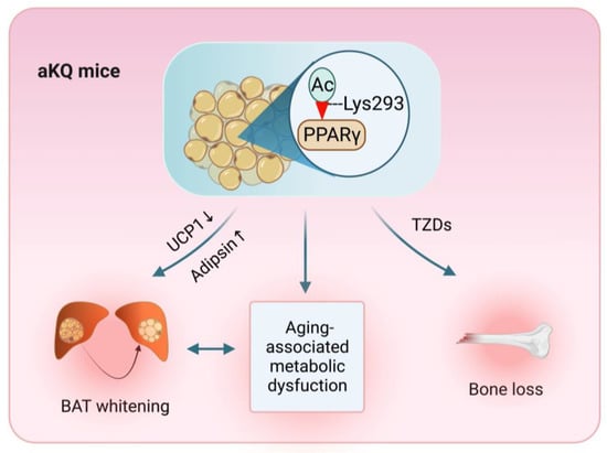PPARγ is hyperacetylated in aging [17], and consistently, the metabolic protections of PPARγ deacetylation are exaggerated in aged 2KR mice, such as the inhibition of visceral adiposity [18] and protection against atherosclerosis [19]. Therefore, in this present study, we evaluated the hypothesis that PPARγ acetylation contributes to aging-associated adipose dysfunction using our unique aKQ mouse model. We further investigated their response to TZD treatment, including assessing the adverse effects on the bone. aKQ mice presented with impaired insulin sensitivity in aging and worsened TZD-induced bone loss. Intriguingly, these detriments were accompanied by an accelerated whitening of brown adipose tissue (BAT). Collectively, our study demonstrates PPARγ acetylation in adipose tissue as a pathogenic factor underlying metabolic dysfunction in aging and obesity.
