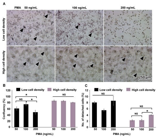 THP-1 macrophages on day 0. (A) The overall morphology of adherent cells and the round cell colonies linked with the adherent cells (arrowheads). (B) Percentage of area confluency analyzed with ImageJ. (C) Percentage of detached cells. Values are presented as mean ± standard deviation. Data were analyzed using ANOVA with Tukey test for multiple comparisons. * Statistically significant (p < 0.05). NS = not significant.