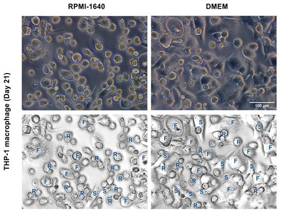 Morphology of THP-1m after 21 days in RPMI-1640 and DMEM. Top panels show the phase-contrast microscopic images. Bottom panels show examples of identified morphologies. R = round, S = spindle-like, and F = fried egg.