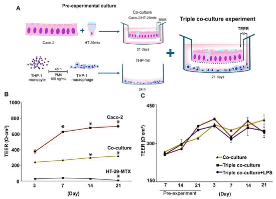 Changes in transepithelial electrical resistance (TEER) in triple co-culture of THP-1m with intestinal epithelium. (A) Schematic illustration of the triple co-culture setup. (B) TEER values were measured in monoculture and co-culture before the experiment, and (C) in the triple co-culture for a 21-day period. Values are presented as mean ± standard deviation. * Statistically significant compared with day 3 of the same culture (p < 0.05).