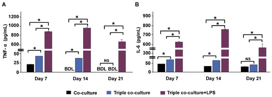 Cytokine secretions in triple co-culture and triple co-culture with LPS-induced inflammation. The levels of tumor necrosis factor-alpha (TNF-α) (A) and interleukin (IL)-6 (B) in culture media were measured on days 7, 14, and 21 during a 21-day long-term culture by collecting half of the culture media from both the apical panel and basolateral panel. Values are presented as mean ± standard deviation. BDL = below the detection limit (TNF-α: 22 pg/mL, IL-6: 6 pg/mL). * Statistically significant (p < 0.05). NS = not significant.