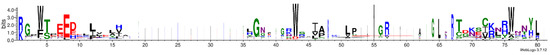 PFAM analysis of the MYB sequences identified 28 combinations (Supplementary Table S2) of 16 domains (Supplementary Table S3), including 6 MYB-related domains. The most frequent of the 28 combinations (detected in 363 genes), designated Group 1, includes MYB_DNA-binding, MYB_DNA-binding, MYB_DNA-bind_6 and MYB_DNA-bind_6 domains. In 8 of the 28 groups, the MYB_DNA-binding domain is present at least twice. In Groups 23 and 26, there are five repetitions of the MYB_DNA-binding domain. The most frequently observed domain after MYB_DNA-binding in the 28 groups is MYB_DNA-bind_6 (in 19 groups). The most frequently observed non-MYB domains along with MYB_DNA-binding are the SWIRM domains (in four groups). The SWIRM domain has a helix-turn-helix motif and binds to DNA [30]. The WebLogo for the identified MYB sequences shows that tryptophan residues at three positions are very highly conserved (Figure 1). In addition to detecting proteins with multi-domain MYB architecture, we also identified 134 members of the 1R-MYB group with just a single MYB domain.
