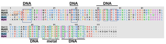 To map the DNA-binding amino acids of domains of the four MYB transcription factors (MYB3, MYB4, MYB13 and MYB59), we aligned their protein domain sequences against the Arabidopsis R2R3-type MYB transcription factor (PDB ID: 6KKS) bound to a DNA recognition sequence (Figure 4). The DNA binding amino acids in 6KKS were identified from the PDBsum database. The alignment indicates that the binding site is well conserved in the MYB domains of MYB3, MYB4, MYB13 and MYB59. Amino acids at 16 of the 23 positions mapped as the DNA-binding site are identical, corroborating the high conservation at these positions. Of the three amino acids, two (alanine and arginine) binding to the metal are identical in all four MYB sequences.