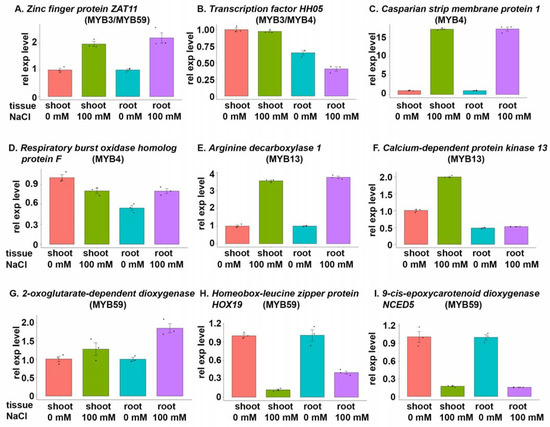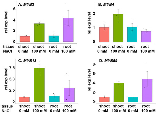 MYB13 is involved in DNA binding, transcription activity, sequence-specific DNA binding and regulation of DNA-templated transcription [64,65,66]. Tissue-specific analysis has shown that it is expressed more strongly in roots than in shoots and is upregulated in abiotic stress conditions. Previous studies with rice, maize, Tartary buckwheat and Arabidopsis have revealed links between salt tolerance and MYB13 [67,68,69]. Collectively, these results support our finding that MYB13 is upregulated under salt stress (Figure 5).