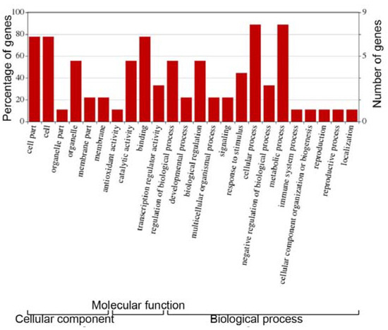 Results of gene ontology analysis of the nine genes involved in salt stress predicted to be regulated by MYB proteins. The results are classified into three categories: cellular component, molecular function and biological process. The left and right y-axes, respectively, show the percentage and number of the nine genes involved in each of the components, functions or processes.
