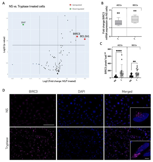Tryptase induced pro-survival expression in alveolar and bronchial epithelial cells. A profiler gene array associated with cell survival and apoptosis genes was performed on BECs (based on three independent experiments) and the results are shown as a volcano plot (A). Upregulated gene expression of BIRC3 was confirmed via qPCR in both AECs and BECs (B) and was based on five independent experiments/cell types. Quantification of BIRC3 protein expression (pixels+/cellstotal) in AECs and BECs (positive cells were analyzed in ≥4 fields of view with 10× magnification in three independent experiments) using fluorescence immunocytochemistry and Image-J (C). Representative micrographs of immunofluorescently stained BIRC3 (FITC, magenta) and nuclei (DAPI, blue) in BEAS-2b cells stimulated with tryptase and compared to NS cells (D). Scale bar in (D), upper left: 100 µm, magnifications: 10 µm. Statistical significance between non-stimulated and tryptase-stimulated cells was tested using the Mann–Whitney test. Data represent the mean ± SD, ** p < 0.01, **** p < 0.0001.