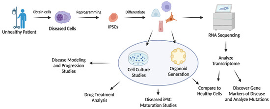 Transcriptome analysis is beneficial for understanding disease and providing insight into potential regenerative medicines capable of mitigating or treating disease. This commonly encompasses utilizing iPSCs derived from patients’ tissues to generate diseased organoids for research (Table 4) [85,86,87,88,89,90,91]. Figure 5 summarizes the key steps in disease modeling through a combination of iPSC technology and transcriptomics for regenerative medicine. For instance, iPSC-derived brain cells have been utilized to mimic the progression of Alzheimer’s disease (AD) to study the transcriptomic effect on cells. These patient-derived brain cells obtained from iPSC differentiation showed genotypes and phenotypes associated with AD [85]. Zhao et al. generated cerebral organoids from AD dementia patient-derived iPSCs. Transcriptomic profiling revealed that the cerebral organoids originating from AD patients showed abnormal cytoplasmic RNA granules and deranged RNA metabolism [92]. The studies provide a more in-depth understanding of the disease.