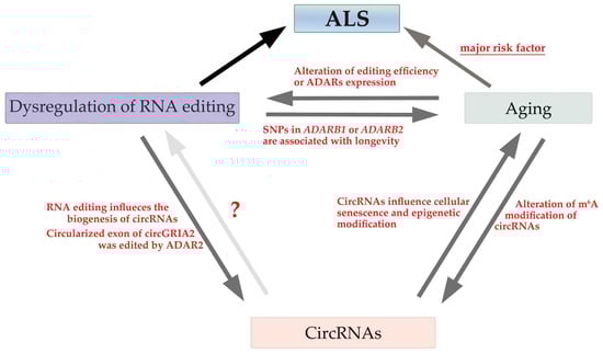 Role of aging, circRNAs, and the dysregulation of RNA editing in ALS pathogenesis. The association between aging and circRNAs or dysregulation of RNA editing has been identified. However, no evidence regarding whether circRNAs influence the dysregulation of RNA editing exists. Moreover, although the involvement of circRNAs in the pathogenesis of ALS has not been demonstrated, aging is a major risk factor for ALS, and the dysregulation of RNA editing is involved in the pathogenesis of ALS.