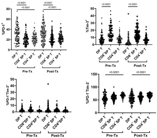 Percentages of T-cells of DP CD3+CD4+CD8+, SP CD3+CD4+ and SP CD3+CD8+ phenotype expressing exhaustion markers. Pre-Tx—before treatment; Post-Tx—after treatment. Horizontal lines within each population of results represent median values. Numbers above lines representing statistical comparisons indicate p values.