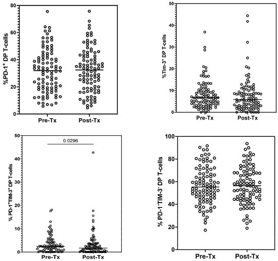 The percentage of DP T-cells expressing either PD-1 or Tim-3 did not change significantly following treatment (from 31.6 (5.7–75.5) to 32.2 (4.5–75.7)% and from 6.7 (0.0–36.9) to 5.8 (0–44.4)% for PD-1 and Tim-3, respectively) (Figure 4). Similarly, there were no statistically significant differences in the percentages of DP T-cells with neither PD-1 nor Tim-3 expression (55.3 (17.2–91.7)% vs. 56.4 (19.0–93.7)%). However, the percentage of DP T-cells co-expressing PD-1 and Tim-3 significantly decreased after treatment (from 2.4 (0.0–18.1) to 1.7 (0.0–42.7)%, p = 0.0296) (Figure 4).