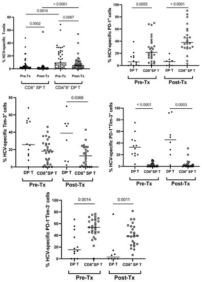Percentages of HCV-specific T-cells of DP CD3+CD4+CD8+ and SP CD3+CD8+ phenotype expressing exhaustion markers. Pre-Tx—before treatment; Post-Tx—after treatment. Horizontal lines within each population of results represent median values. Numbers above lines representing pairwise comparisons indicate p values.