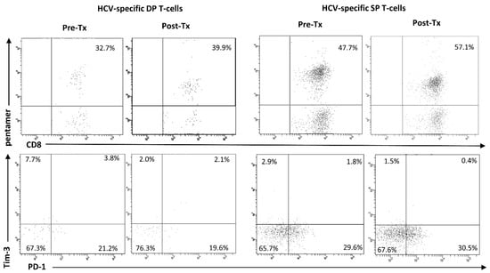Importantly, HCV-specific DP T-cells were characterized by a distinct pattern of PD-1/Tim-3 expression, implying higher exhaustion of these cells, possibly due to antigen overstimulation and triggering, again pointing to their involvement in HCV-specific immunity. For comparison, in HIV-1 infection, the frequency of DP T-cells as well as the expression of activation and exhaustion markers on these cells increased as the infection progressed [,]. Interestingly, the observed differences were mostly retained between pre- and post-treatment, which implies that the exhaustion phenotype of HCV-specific DP T-cells is poorly modifiable once the “offending” pathogen is eradicated. A similar observation we made previously in the case of SP HCV-specific T-cells [].