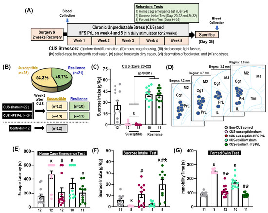 In experiment 1 (Figure 1), the procedures for stereotaxic surgery, CUS paradigm, deep brain stimulation, and behavioral testing were conducted as previously described [2,21,22,24]. After 2 weeks of recovery from the electrode implantation procedure, animals were subjected to the CUS paradigm for 5 weeks. Blood samples were collected on the day before the CUS procedure and after 1 h of HFS PrL on the day of sacrifice. The sucrose intake test was conducted after 3 weeks of CUS (on day 20–22) and at week 4 after HFS PrL (on day 30–32). Animals were categorized as either susceptible or resilient to CUS-induced depression based on the sucrose intake test after week 3 of CUS. In accordance with earlier studies, animals were categorized as susceptible to depressive-like or anhedonia-like behavior if there was a 40% reduction in sucrose consumption compared with the average sucrose intake of the non-CUS controls [5,26], whereas the remaining animals were categorized as resilient to depressive-like behavior (Figure 1B,C).