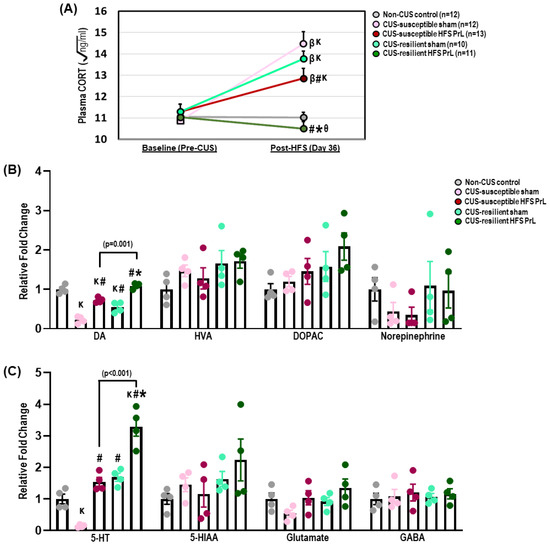 Effects of HFS PrL on the levels of corticosterone and hippocampal neurotransmitters. (A) HFS PrL in both CUS-susceptible and -resilient groups significantly reduced the levels of plasma CORT compared with their respective sham groups on day 36 of CUS (F(4,53) = 16.908, p < 0.001). (B) Mass spectrometry analysis showed decreased DA in CUS-susceptible and -resilient sham groups compared with non-CUS controls (F(4,15) = 52.892, p < 0.001). Interestingly, HFS PrL in both CUS-susceptible and -resilient animals increased DA levels compared with their respective sham groups. No significant differences were observed for HFS PrL on DA metabolites including HVA and DOPAC among groups (B,C). Although we found significant increases in 5-HT neurotransmitter levels in both CUS-susceptible and -resilient HFS PrL animals compared with their respective sham groups (F(4,15) = 44.070, p < 0.001), there were no differences in 5-HIAA levels (C). No significant differences were observed for norepinephrine, glutamate, and GABA among groups. Indication: K, significant difference from non-CUS controls, p < 0.05; β, significant difference from baseline CORT before CUS procedures, p < 0.05; #, significant difference from CUS-susceptible sham, p < 0.05; *, significant difference from CUS-resilient sham, p < 0.05. θ, significant difference from CUS-susceptible HFS PrL, p < 0.05.