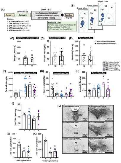 In Experiment 2 (Figure 5), to distinguish the underlying mechanisms of the role of DA-dependent and -independent processes on the antidepressant-like effects by HFS PrL, dopaminergic cells in the DRN (AP: −7.4 mm, ML: +1.0 mm, VL: −5.8 mm; approached at a coronal angle of 10°) and VTA (AP: −5 mm, ML: ±0.8 mm, VL: −8 mm) were lesioned by 6-OHDA, a potent neurotoxin for dopaminergic neurons [27]. Animals were placed on a stereotactic apparatus and anesthetized with 2.5% isoflurane throughout the surgical procedure. The 6-OHDA solution was prepared by dissolving 4 µg/µL of 6-Hydroxydopamine hydrochloride (ChemCruz, California, CA, USA.) in 0.2% ascorbic acid in 0.9% saline. Lesioning in the DRN or VTA was performed by micro-injection of 2 µL 6-OHDA solution at an injection rate of 0.1 µL per min through a stainless-steel injection cannula (33 gauge; C315FDS-4/SPC, Plastics One Inc., Roanoke, VA, USA) connected by tubing to a 10 µL Hamilton syringe and infusion pump (Pump11 Elite, Harvard Apparatus, Holliston, MA, USA). After injection, the needle was left in place for 15 min to allow the 6-OHDA to completely diffuse within the injected area. After lesioning, stimulating electrodes were implanted in the PrL (AP: +3.24 mm, ML: +/−0.7 mm, VL: −3.0 mm) and animals were allowed to recover for 2 weeks. To protect the noradrenergic neurons from lesioning by 6-OHDA, a single dose of desipramine hydrochloride (25 mg/kg in 0.9% NaCl solution; Sigma-Aldrich, St. Louis, MO, USA) was injected intraperitoneally 30–60 min prior to the surgery [28].
