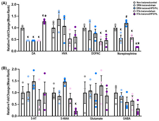 Effects of HFS PrL on the levels of hippocampal neurotransmission in DA-lesioned animals. (A) Mass spectrometry analysis demonstrated reduced levels of DA in DRN-lesioned sham and HFS PrL animals and VTA-lesioned sham animals compared with non-lesioned controls (all F(2,6) < 108.000, p < 0.001). Interestingly, VTA-lesioned HFS PrL animals showed significantly increased DA and reduced norepinephrine levels compared with non-stimulated VTA-lesioned sham animals (all F(2,6) < 94.500, p < 0.001). (A,B) There were no significant differences in HVA, 5-HT, glutamate, and GABA levels among the groups. Indication: K, significant difference from non-CUS controls, p < 0.05; #, significant difference from DRN-lesioned sham, p < 0.05; *, significant difference from VTA-lesioned sham, p < 0.05.