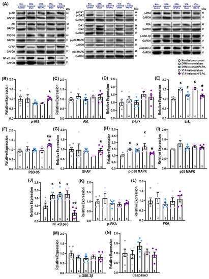 HFS PrL enhances hippocampal neuroplasticity-related function. (A) Graphical representation of the effects of HFS PrL on the protein expression of neuroplasticity-related markers. VTA-lesioned HFS PrL animals had significantly increased expressions of p-Akt (p = 0.003, (B)); PSD-95 (p = 0.026, (F)); and GFAP (p = 0.034, (G)) compared with VTA-lesioned sham group. Both VTA- and DRN-lesioned sham groups showed increased expression of Erk1/2, p-p38 MAPK, and NF-κB. Interestingly, VTA-lesioned HFS PrL animals had remarkably reduced expression of Erk1/2 (F(2,12) = 19.890, p < 0.001, (E)); p-p38 MAPK (F(2,13) = 9203, p = 0.003, (H)); and NF-κB (F(2,12) = 10.038, p = 0.003, (J)) back to levels comparable to the non-lesioned controls. No significant differences were observed for Akt (C), p-Erk (D), p38 MAPK (I), p-PKA (K), PKA (L), p-GSK-3β (M), and caspase-3 (N) levels (all F(2,12–13) < 3.473, p < 0.865) among the groups. Indication: K, significant difference from non-CUS controls, p < 0.05; #, significant difference from DRN-lesioned sham, p < 0.05; * significant difference from VTA-lesioned sham, p < 0.05.