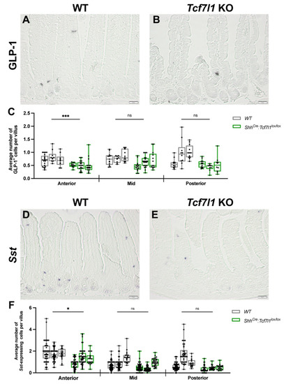 The numbers of L-cells in the middle and posterior parts were also lower in Tcf7l1KO animals, yet a statistical significance was not reached (p-values for middle and posterior regions are 0.081 and 0.084, respectively). Furthermore, RNA in situ hybridization analysis for the D-cell marker Somatostatin (Sst) showed a significant reduction (1.5-fold) in D-cell number in the anterior part of the small intestine of Tcf7l1 knockout mice compared to controls (Figure 5D,F). Altogether, these findings suggest that TCF7L1 promotes the differentiation of enteroendocrine cells along D- and L-cell lineages in the anterior small intestine.