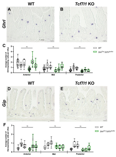 RFX6 is also required for the differentiation of enteroendocrine progenitors along K- and X-cell lineages [33]. Therefore, we examined whether Tcf7l1 loss in the intestinal epithelium resulted in similar defects. RNA in situ hybridization analysis for the expression of X-cell marker Ghrelin (Ghrl) did not reveal significant differences in the number of Ghrl-positive cells between ShhCre-EGFP:Tcf7l1lox/lox and control small intestines (Figure 5A–C). Additionally, no significant differences were found in the number of Gastric inhibitory peptide (Gip)-positive K-cells between Tcf7l1 knockout and wild-type mice (Figure 5D–F). These results indicate that TCF7L1 is not necessary for X- and K-cell differentiation.