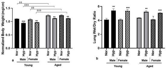 We performed a comparative analysis between young and aged male and female Akita mice before and after hyperoxia exposure (O2 > 90% for 72 h). The effect of hyperoxia on physical parameters like body weight and lung weight was analyzed. When compared to young mice, the body weight (normalized to tibia length) of aged mice was significantly higher regardless of the sex and exposure condition (Figure 1a). The hyperoxic groups significantly lost body weight irrespective of sex and age groups. No statistically significant sex-related body weight change was observed in young or aged groups. Hyperoxia exposure resulted in lung injury and manifested as lung edema. We assessed the lung wet to dry (W/D) ratio as an indication of successful hyperoxia exposure after 72 h. Both young and aged Akita mice showed a significant increase in lung W/D ratio without any sex-specific differences post-hyperoxia (Figure 1b).