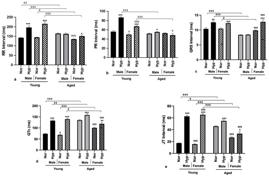 Pre-existing electrical disparities in aged Akita mice. ECG analysis in lead II mode in normoxia/hyperoxia treated aged and young male and female Akita mice. RR interval (a), PR interval (b), QRS interval (c), QTc interval (d), and JT interval (e). All bar diagrams show mean (±SEM) of n = 12 per group. * p < 0.05, ** p < 0.005, *** p < 0.0005. * compares effects of hyperoxia and normoxia of same sex and age; Y compares male and female mice of the same age and treatment; ‡ compares young and aged mice from the same sex and treatment.