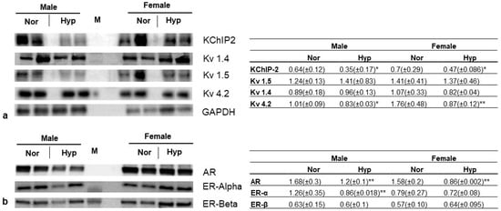 The experimental methods for protein quantification and analysis were all adapted from our previous publication []. Briefly, approximately 30 mg of left ventricle tissue was excised from both groups and homogenized in cell lysis buffer (Cell Signaling Technology, Danvers, MA, USA) containing a protease cocktail (Sigma Life Science, Burlington, MA, USA) and PMSF. The homogenized samples were centrifuged at 15,000 rpm for 30 min at 4 °C, and supernatant was quantified for 50 μg of equivalent proteins using the Pierce™ BCA Protein Assay Kit (Thermo Fisher Scientific). Each sample was denatured and loaded into an SDS-PAGE precast gel (Bio-Rad Laboratories, Hercules, CA, USA). Blots were later blocked in 5% w/v nonfat dry milk for 1 h and probed in 1:5000 dilutions of primary antibodies for Kv1.4 (AB5926) and GAPDH (Millipore) antibodies, and 1:1000 dilutions of KChIP2 (Abcam, Cambridge, MA, USA), Kv4.2 (Millipore, Billerica, MA, USA), estrogen receptor beta (Thermo Fisher, CA, USA), androgen receptor (Abcam, Cambridge, MA, USA), and Kv1.5 antibody (Santa Cruz Biotechnology, Dallas, TX, USA). The band intensities from GAPDH were used to normalize the target proteins using ImageJ software.