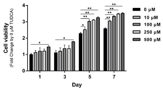 Proliferation of hMSCs induced by TUDCA. hMSCs were treated with TUDCA at concentrations of 10, 100, 250, and 500 μM, and cell proliferation was evaluated daily using water-soluble tetrazolium salt (WST) -1 assays. A microplate reader was used to measure the absorbance at 450 nm. All data represent the mean ± S.D. of five independent experiments. * p < 0.05, ** p < 0.001 versus the control group.