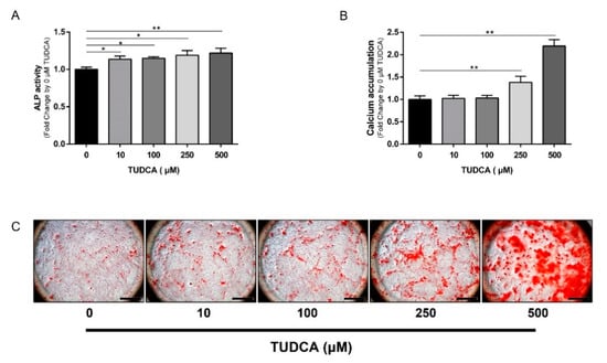 Osteogenic differentiation of hMSCs induced by TUDCA. hMSCs were treated with TUDCA at concentrations of 10, 100, 250, and 500 μM. (A) ALP activity assay results on day 7 after TUDCA treatment. (B) Calcium accumulation values of cells stained with AR-S solution 20 d after TUDCA treatment. (C) Images of cells stained with AR-S solution. Scale bars = 1 mm. All data represent the mean ± S.D. of five independent experiments. * p < 0.05, ** p < 0.001 versus the control group.