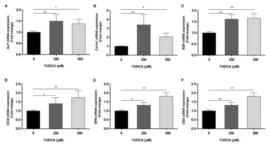 As shown above, osteogenic differentiation was remarkably induced at 250 and 500 μM TUDCA in hMSCs. Therefore, we investigated osteogenic differentiation at the mRNA level at these two concentrations. The expression of osteogenic differentiation gene markers was determined using qRT-PCR. The expression of ALP, COL1A1, BSP, OCN, OPN, and OSX was significantly higher in 500 μM TUDCA treatment. The expression of ALP, COL1A1, BSP, OCN, and OPN was significantly high in 250 μM TUDCA treatment, but not OSX (Figure 3).