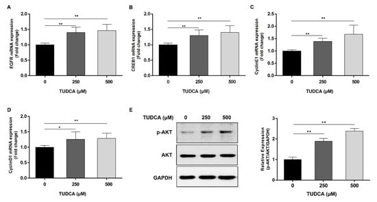 Identification of EGFR signaling pathway genes in hMSCs treated with TUDCA. hMSCs were treated with TUDCA at concentrations of 250 and 500 μM, total RNA and protein were extracted from the cells, and then qRT-PCR and Western blotting were performed. (A–D) The mRNA levels of EGFR, CREB1, cyclin D1, and cyclin E1 were determined and normalized to GAPDH mRNA. (E) Protein levels of p-Akt, Akt, and GAPDH were determined. All data represent the mean ± S.D. of five independent experiments. * p < 0.05, ** p < 0.001 versus the control group.