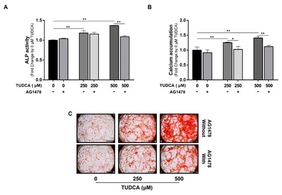Inhibition of TUDCA-induced osteogenic differentiation of hMSCs by an EGFR inhibitor (AG1478). hMSCs were pretreated with AG1478, an EGFR inhibitor, and then treated with 250 and 500 μM TUDCA, and each experiment was performed by time. (A) ALP activity after 7 d; (B,C) calcium accumulation after 20 d were determined, and an image of cells stained with AR-S solution is shown. Scale bars = 1 mm. All data represent the mean ± S.D. of five independent experiments. * p < 0.05, ** p < 0.001 versus the control group.
