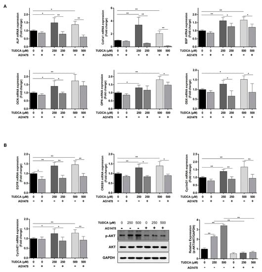 Genes related to TUDCA-induced osteogenic differentiation were searched in a gene database (https://www.genecards.org, accessed on 27 May 2022), and those with high relevance scores, namely EGFR and CREB1, were identified. These two genes are correlated with each other [,,]. The EGFR is known to play an important role in osteogenic differentiation [,], and CREB1 is known to regulate cyclin D1 and cyclin E1 [,,,]. Based on these findings, this study was conducted based on the hypothesis that the EGFR is induced by TUDCA, and the nuclear CREB1 transcript reacts with Akt phosphorylation to regulate bone differentiation by regulating the target genes cyclin D1 and cyclin E1. We found that EGFR/p-Akt/CREB1 was induced by TUDCA in hMSCs (Figure 4). To validate this result, the EGFR/p-Akt/CREB1 pathway was evaluated after treatment with 10 μM of the EGFR inhibitor, AG1478. The expression of EGFR/p-Akt/CREB1 was reduced, as was the expression of cyclin D1 and cyclin E1. ALP activity and calcium accumulation by TUDCA were reduced by treatment with an EGFR inhibitor, and COL1A1 was particularly decreased among osteogenic differentiation marker genes (Figure 5 and Figure 6).