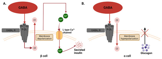 Possible mechanisms of GABA in the beta and alpha cells. (A) In the beta cells, GABA binds the GABA receptor and causes an efflux of chloride ions. This leads to depolarization of the membrane, which opens L-type calcium ion channels and allows calcium ions to enter the cell, facilitating insulin secretion. (B) In the alpha cell, there is an influx of chloride ions after GABA binds the GABA receptor, and this causes membrane hyperpolarization, preventing glucagon from being secreted out of the cell.