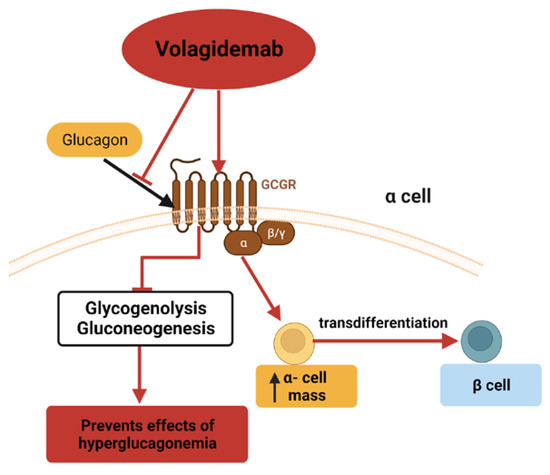 Hyperglucagonemia is present in diabetes, and lowering glucagon levels improves glycemia [52]. When insulin secretion is lost in type 1 diabetes, paracrine inhibition on the α-cells is disrupted, too much glucagon is released, and glucose levels are worsened due to glycogenolysis and gluconeogenesis [52]. As shown in Figure 4, volagidemab (REMD-477) is a humanized glucagon receptor monoclonal antibody (GCGR mAb) that is being investigated for its therapeutic potential in diabetes because it antagonizes the glucagon receptor and may be able to prevent these negative effects of hyperglucagonemia [53].