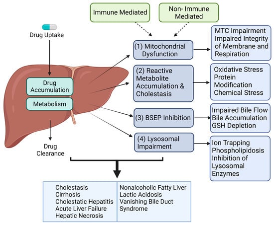 Schematic of potential mechanisms of iDILI. Immune and non-immune mechanisms are both critical, and contribute to (1) mitochondrial dysfunction, (2) reactive metabolite accumulation and cholestasis, (3) BSEP inhibition, and (4) lysosomal impairment which contributes to the development of cirrhosis, acute liver failure, hepatic necrosis, nonalcoholic fatty liver, vanishing bile duct syndrome, lactic acidosis, cholestasis, and cholestatic hepatitis. The schematic figures were generated using BioRender (biorender.com, accessed on 10 January 2023).