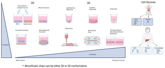 Schematic of co-culture models and cell sources. The schematic diagram illustrates static two-dimensional models such as monocultures, mixed co-cultures, transwell co-cultures, and micropatterned co-cultures and three-dimensional models such as spheroids, organoids, bioprinting, microfluidic chips, and perfusion-based microfluidic devices/bioreactors (e.g., 3D liver-on-a-chip). Models can include 2D and 3D components. It also highlights liver cell sources that are often used in these models including primary, immortalized, and NPC cells from different species.